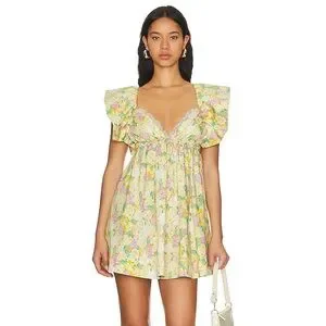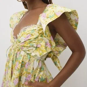 Turn heads in this gorgeous For Love & Lemons Tamra Mini Dress, brand new with tags. This flirty mini is designed in a soft yellow floral print with hints of pink and green, making it the perfect piece for spring and summer events.