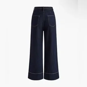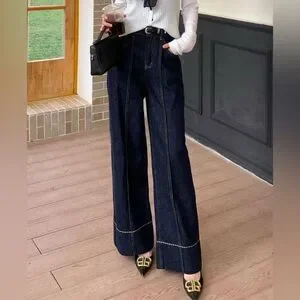 Chic dark blue flare jeans. Elegant wide-leg style. Perfect for casual outings.