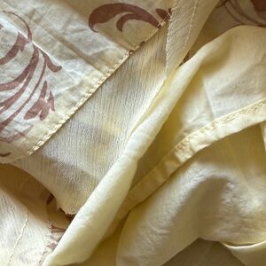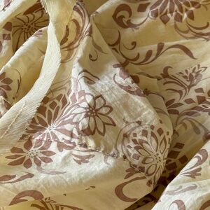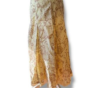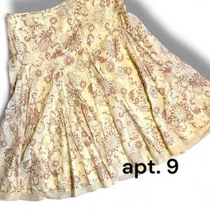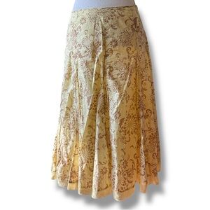 Elegant midi skirt with a floral pattern in butter yellow and taupe/ brown tones.