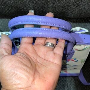 Stylish tote with a vibrant floral pattern. Features purple handles and accents. Perfect for any occasion.