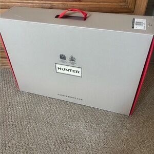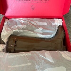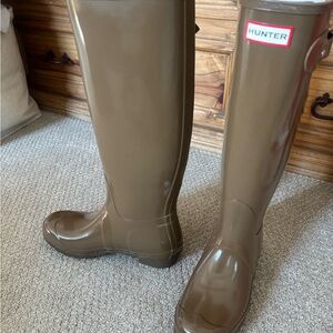 Stylish Hunter tall rain boots in brown. Perfect for rainy days. Color is Mushroom. Brand new and still in the box. Very stylish!