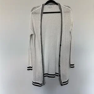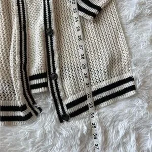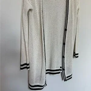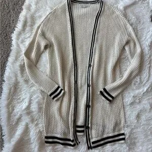 Chic cream cardigan with black accents. Button closure. Long sleeves. Ideal for layering.