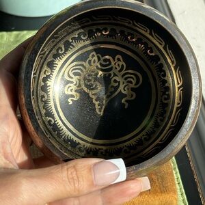 Tibetan Singing Bowl with a black and gold finish, featuring the Om symbol and potentially the Om Mani Padme Hum mantra.