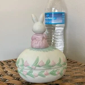 Charming trinket box featuring a pastel bunny design. Perfect for storing small treasures. The soft pink and cream colors add a touch of elegance to any room.