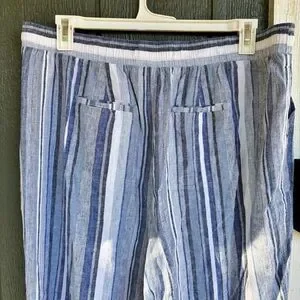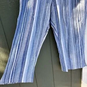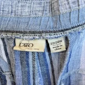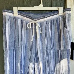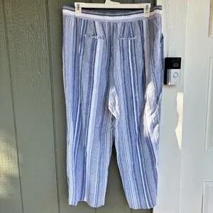 Lightweight and breathable Cato striped pants in size 22/24W. Linen/rayon blend with elastic waistband and drawstring tie for comfort. Straight/cropped leg with pockets. Perfect for warm weather or casual everyday wear.
