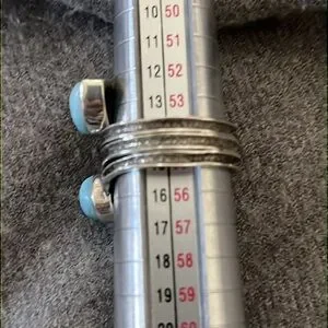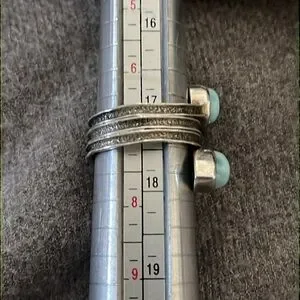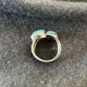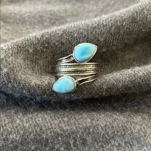 Sterling Artisan Larimar Ring-size 7. No marks-acid tested positive for sterling silver. Has crossover look (not adjustable) with 2 teardrop Larimar stones. Approximately 1/4” wide. Weight is 5.6 grams; condition-shows some wear but stones are not scratched up.