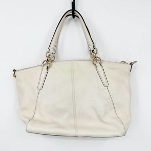 Elegant cream satchel with gold star embellishments. Features dual handles and detachable strap. Perfect for any occasion.