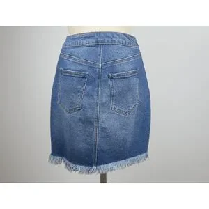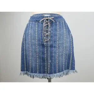 Chic denim mini skirt with stylish lace-up detail. Frayed hem adds flair.