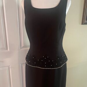 This elegant black maxi dress is perfect for any occasion. Its sleek design and classic color make it a versatile addition to your wardrobe. This dress is so slimming and fun to wear. I love the beaded pearls and roping decide at waist.