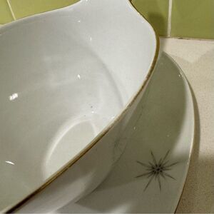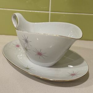 Enhance your dining experience with this elegant white gravy boat featuring a charming MCM starburst design. Perfect for serving sauces and gravies in style.