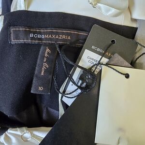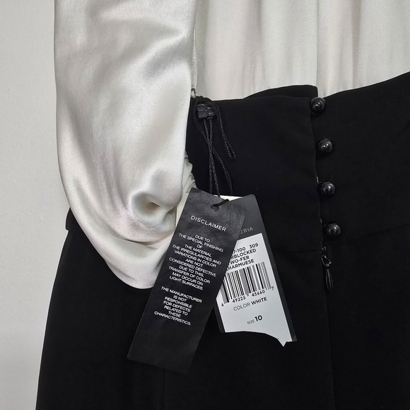BCBG Maxazria Colorblocked Two-Fer Charmuese in black and white Dress. Drop back, Draped 100% Silk top.