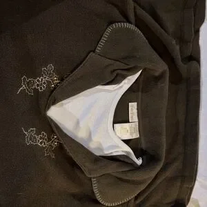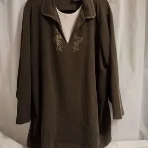 Cozy, hunter green Bobbie Brooks pullover sweater with floral embroidery. Perfect for casual wear. It looks like there are 2 pieces, but there's a fake white turtle neck piece. Please see pics for measurements & details. Great sweater for Fall & Winter. Non-smoking home. Thanks for looking at my closet!