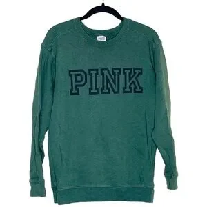 Victoria's Secret PINK Campus Sweatshirt Pullover Long Sleeve Green Black Letters Logo Vintage Style Size XS