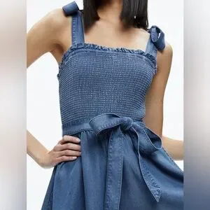 This cute and easy-to-wear romper is cast in a gorgeous shade of dark chambray with smocking at the chest, plus a loose short construction. The tie at the waist lends a feminine touch. Our blue romper is perfect for relaxed summer days.