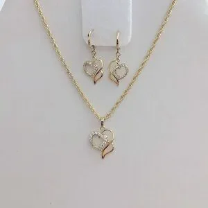 This charming gold jewelry set epitomizes elegance and style. The necklace features a golden chain with a heart-shaped pendant, partially adorned with small clear stones and an additional golden spiral design interwoven with the heart. The matching earrings complete the set, each with a similar heart and spiral design, also partially adorned with small clear stones.