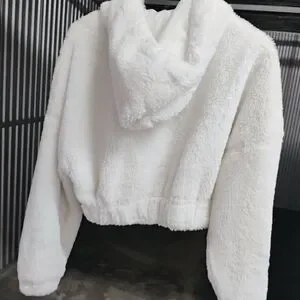 Plush teddy jacket with a cozy hood. Features a stylish zip closure. Perfect for warmth and comfort.