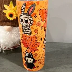 Vibrant orange tumbler with Halloween graphics. Features playful characters and pumpkins.
