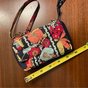 Like New! Stylish and vibrant, this Vera Bradley wristlet features a beautiful floral design. Perfect for adding a pop of color to any outfit. Outside pouch to hold phone (see measurements) while zipper opens spacious wallet with room for cards, id, coins, and cash.