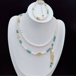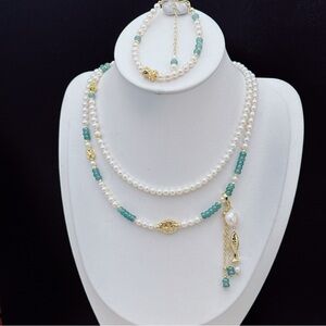 This handmade jewelry set features high quality freshwater pearls paired with natural jade beads, offering timeless elegance and versatile styling. The long necklace can be worn single, doubled, or layered, while the matching bracelet completes the look with refined charm. Perfect for special occasions or elevating everyday outfits.