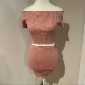 Elevate your style with this chic off-shoulder ribbed skirt set. Perfect for any occasion, this pink ensemble offers a flattering fit and trendy look.