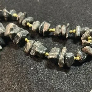 This elegant necklace features a stunning combination of gray stones and gold beads, perfect for adding a touch of sophistication to any outfit. Approximately 12”. G148