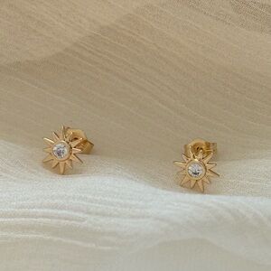 Dainty 18K gold plated over brass sun earrings featuring small Clear CZ stone in center