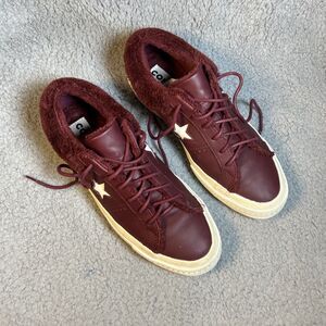 Elevate your style with these CONVERSE 1 Star Oxford leather sneakers, perfect for any occasion from casual outings to activewear. The burgundy color and solid pattern give a classic and timeless look, while the fur lining and trim accents add a touch of luxury. These lace-up sneakers feature a medium shoe width and are designed with a comfortable fit for women in US size 7.5 and UK size 7.5.
