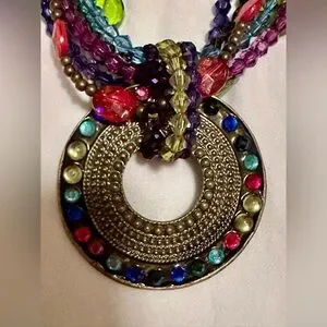 Make a bold statement with this eye-catching multistrand beaded necklace! Featuring a beautiful mix of blue, purple, pink, and green beads, this piece is finished with a stunning circular statement pendant that adds texture and shine. Perfect for dressing up a simple outfit or adding a pop of color to your look.