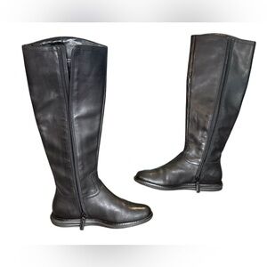 These Original Grand knee-high boots from Cole Haan feature a sleek black leather exterior with a smooth finish. Designed for comfort, they have a rounded toe and a flat sole, making them perfect for winter and rainy days.