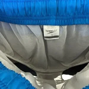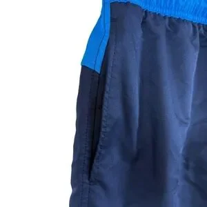These Speedo swim trunks are perfect for any water activity, from swimming laps to lounging by the pool. They feature a comfortable elastic waistband with a drawstring for a secure fit, and a built-in mesh liner for added support. The dark blue and bright blue color block design is stylish and eye-catching, and the Speedo logo on the leg adds a touch of sporty flair. Made from lightweight, quick-drying fabric, these trunks are ideal for travel and easy care. They are in excellent condition.