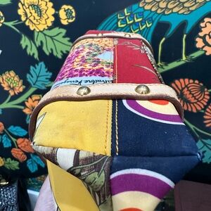 Vivid, artistic, and collectible – this Ferragamo satchel showcases a striking multicolor jungle-and-floral print with a central jaguar motif. Crafted in durable canvas with natural vachetta leather trim and brass hardware, it balances bold design with timeless Italian craftsmanship. Features double rolled leather handles, a top zip closure with tassel pull, and a pastel interior with gold logo stamp and serial number.