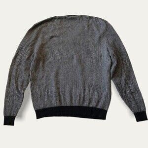 Bobby Jones Collection soft wool cashmere blend chevron zigzag pattern pullover sweater in monochrome gray and black. V-neck. There is a discoloration on the back top of the left sleeve, as shown in the last photo. It may be ink or the way the yarn is. No other issues. Men's size XL.