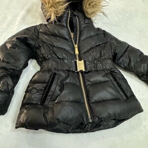 Michael Kors Girls Belted Stadium Puffer Jacket With Faux Fur Hood. Girls size 3T with beautiful gold metal buckle and zipper with logo. Removable hoodie. Inside is fleece with a pocket. Was used very little.