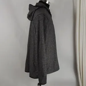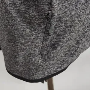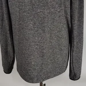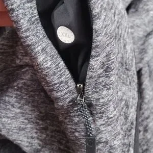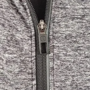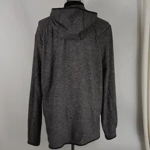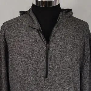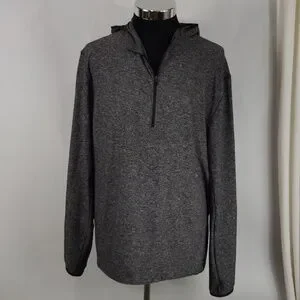 Lululemon Surge Warm 1/2 Zip Hoodie. Heathered Black color. Long sleeves with thumb loops. Small zippered side pocket. In good pre-owned condition. The tag has been removed, but the size dot indicates it is a size XXL. Lying flat it is approximately 29 inches from shoulder to hem. It is approximately 25 inches pit to pit.