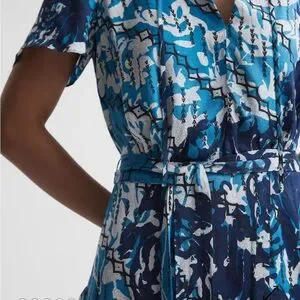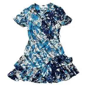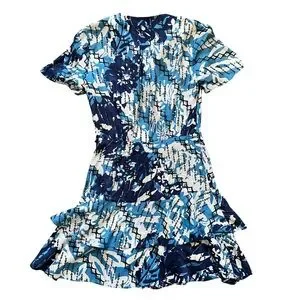 The Reiss Posey is a mini dress with a ditsy blue and white print, V-neckline and layered hem. It is 100% viscose and machine washable. It has a side zipper. It’s very feminine and versatile. Size 0.