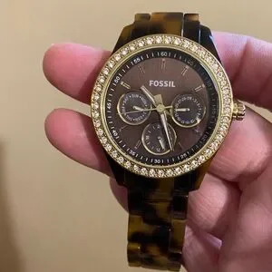 Elegant Fossil watch with a brown band and sparkling gold details. Ideal for any style.