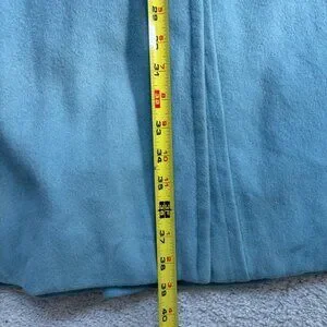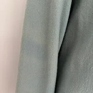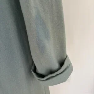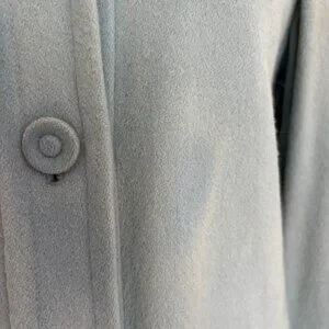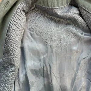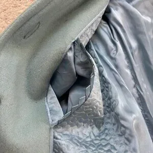 Vintage Wool Lined Dress Coat with Cuffs. Powder blue in color. Color has had some bleeding and there are some stains on it too. See photos. Perhaps a good dry cleaner could remedy this? Pockets are lined and on both sides, there is also a pocket in the inside. Lining is quilted and beautiful. If you are a crafty sewer you could remove the lining and use it for something else?