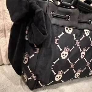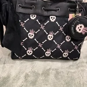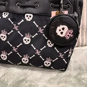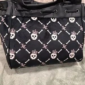 Bold Juicy Couture bag with skull and crossbones design. Features pink accents and crown details. Perfect for a statement look.