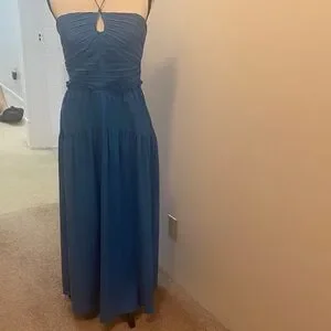 Chic strapless design. Flattering ruched bodice. Flowy maxi length. Perfect for elegant occasions.