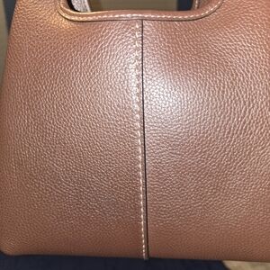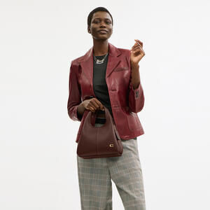 Polished pebble leather Magnetic snap closure leather and fabric lining Side open compartments Handles with 5 drop Detachable strap with 21 1/2 drop for shoulder or crossbody wear 8 3/4 (L) x 7 (H) x 5 1/2 (W) Style No. CM545