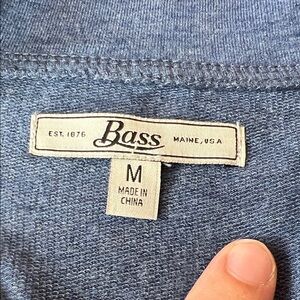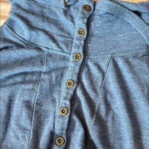 Comfortable knit top by Bass. Soft heather blue fabric. Neckline can be worn open or buttoned up into a mild cowl neckline/turtleneck. Big front pockets. In excellent condition.