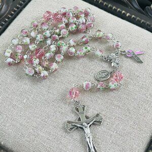 This handmade Catholic Rosary is a meaningful Breast Cancer Survivor gift and a symbol of faith, healing, and hope. Crafted with care, it features lamp work rose beads accented with sparkling pink faceted crystal beads. The rosary honors strength and perseverance with a pink enamel awareness ribbon charm.