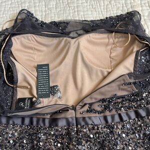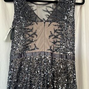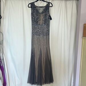 NWT Adrianna Papell Beaded Sleeveless Illusion Maxi Gown gunmetal 8 bridal prom
