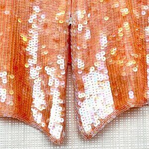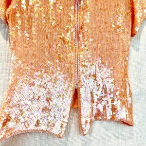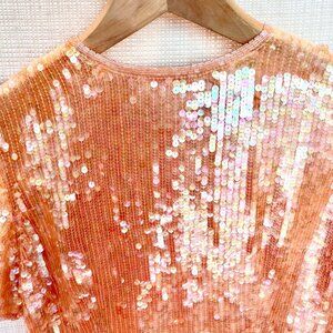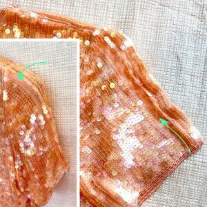 Peach beading around all edges: neckline, shoulders, end of sleeves, all around hem up sides - rest sequins allover
