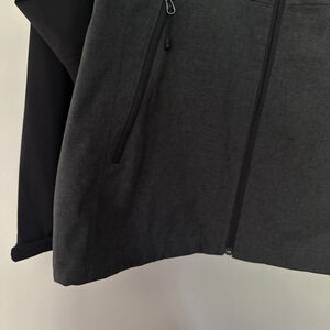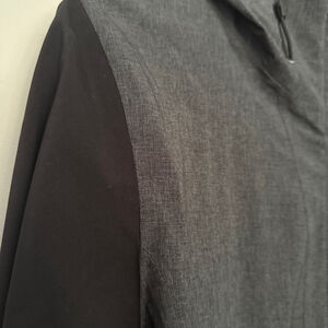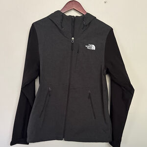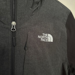 This is a women's The North Face full-zip hooded jacket, featuring a charcoal grey main body with black sleeves and side panels. It includes a full-length front zipper, two zippered hand pockets, and one zippered chest pocket. The hood has adjustable drawstrings, and the cuffs are adjustable with hook-and-loop closures. "HYVENT 2.5L" is embroidered on the left sleeve, indicating its waterproof technology. The jacket is labeled size L/G (Large) for women and appears in good pre-owned condition.