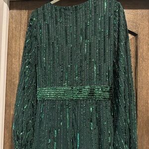 Dazzle in this stunning emerald dress. Features shimmering sequins and elegant long sleeves. Perfect for special occasions. Full length down back zipper fully lined attached tags and extra sequins and bead packet.