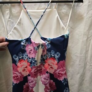 Guess Floral Print Apron Halter dress size 2. White mini dress with a nice colorful floral print, criss cross back straps, back zip closure, some stretch. Straps are non-adjustable. Dress is in very good condition.