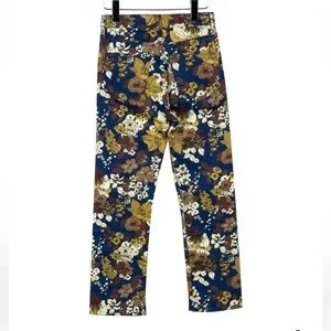 Stylish pants with a vibrant floral pattern. Features blue, brown, and yellow colors. 26 in seam