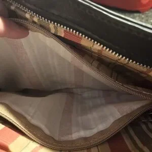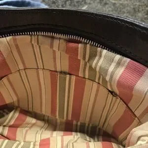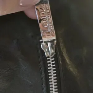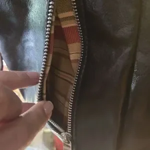 Full grain leather exterior, outside zip pocket, top zip closure, decorative hardware, light beige lining, center zipper pocket divider, zipper pocket, two multifunction pockets,
