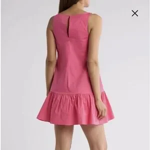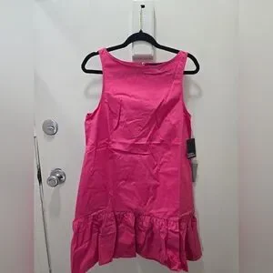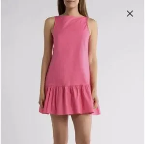 Bright pink mini dress with a playful ruffled hem. Sleeveless design for a fresh look.